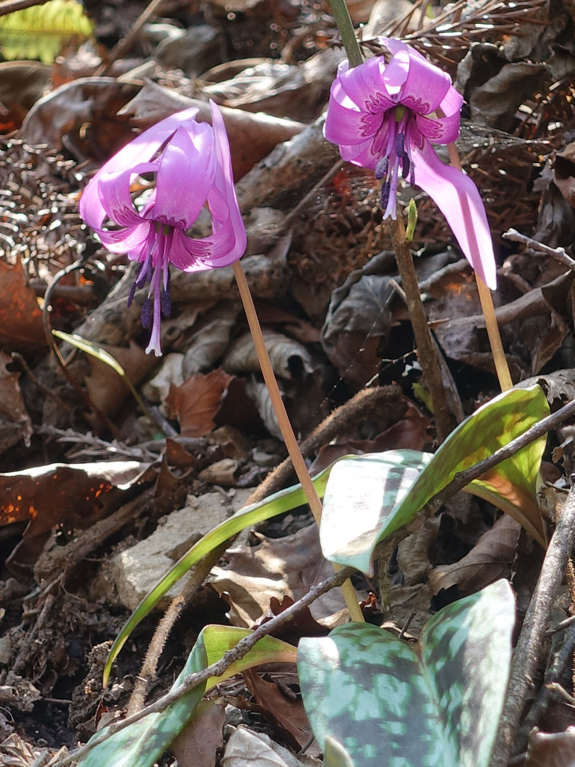 ユリ科 大きな2枚の葉の間から、紅紫色の花を一輪だけつける。 カタクリの花は、日が当たると開いて反り返り、夕方になると閉じる。 春植物、スプリング・エフェメラル「儚い、つかの間の」と呼ばれる。 撮影:2020年4月29日 裏参道 SONY DSC-RX100M5